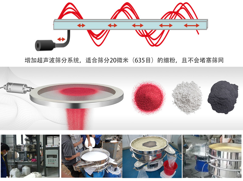 超聲波振動篩在普通篩機(jī)基礎(chǔ)上增加超聲波篩分裝置,超聲波振動篩振頻可達(dá)3.6萬次/秒,適合篩0-625目精細(xì)粉末,產(chǎn)量可提高0.5-10倍.